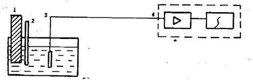 1:溫度控制儀、2:玻璃棒溫度計(jì)、3:溫度傳感器、4:數(shù)字電壓表(測(cè)量放大、自動(dòng)顯示) 循環(huán)式恒溫水槽按圖4所表表示的方法,將溫度傳感器置于循環(huán)杯的幾何中心,進(jìn)行15min的連續(xù)測(cè)試記錄。