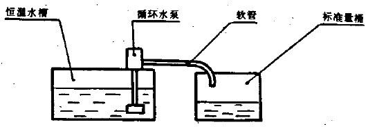 循環(huán)水泵流量試驗(yàn):按圖1所示的方法啟動(dòng)水泵,測(cè)量1min內(nèi)所抽出的水量: 低水位報(bào)警裝置試驗(yàn):按圖1所示的方法啟動(dòng)水泵,將恒溫水槽內(nèi)水抽出,當(dāng)槽內(nèi)水降至所規(guī)定水位時(shí)是否報(bào)警,并檢驗(yàn)電源是否被切斷。